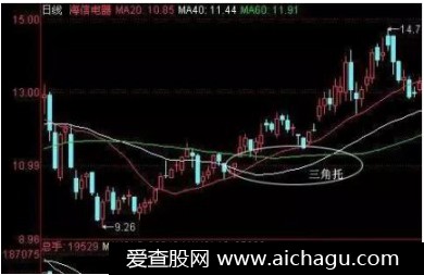 2. 价托:股价经过一段时间的下跌与盘整,中长期均线逐渐走平,20日均线开始上穿40日均线,并向60均线挺进,而40日线也掉头向上,后期的发展就会逐渐形成一个对股价有支撑作用的三角形均线组合,这就是价托,也成三角托。