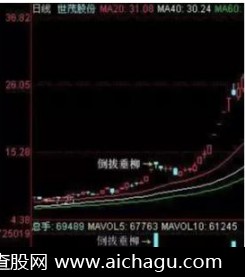 7.倒拔杨柳:股价连续上涨后某日突然高开后一路下跌收出一根天量阴线,此种走势一般是由于利好消息提前泄露,引来众多跟风盘,主力故意作出借利好出货的假像,利用反向思维杀出跟风盘并借散户出逃之机收集筹码,但是天量还是暴露了主力的目的,如此高的接盘只可能是大资金的主力,因此,一般主力还会洗几天盘,让大家彻底失望。