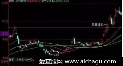 5.放量过头:股价经过一段时间的上涨,已接近近期历史高位,有一日放巨量冲破阻力,突破前期高点,一般预示股价还会向上攀升一段时间。