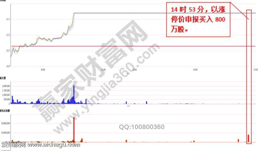 此案例中,该股在以涨停价买入800万股之前,该股已经是有931.43万股的涨停价买入申报尚未成交,其中有314.22万股为其本人申报。