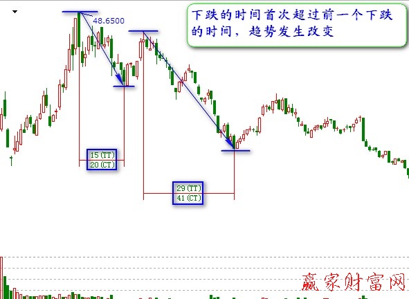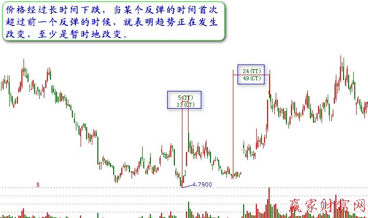 ①如果价格已经下跌了很长一段时间,那么当某个反弹的时间首次超过前一个反弹的时候,就表明趋势正在发生改变,至少是暂时地改变。