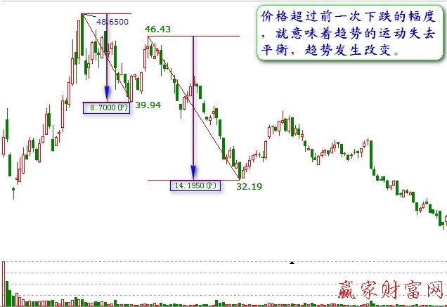 ②如果价格超过前一次下跌或调整的幅度,就意味着趋势的运动失去平衡,而且即将发生。