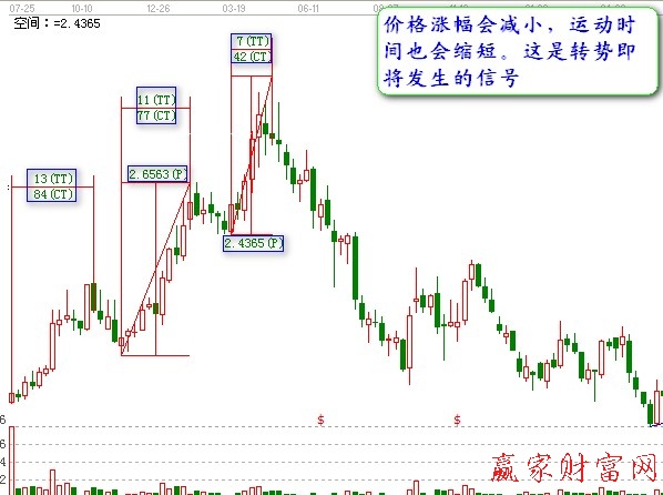 ③当市场正在接近一段时期上涨或下跌的终点,而且到达每三段或每四段时,相比前一段的市场运动,价格涨幅会减小,运动时间也会缩短。这是转势即将发生的信号。