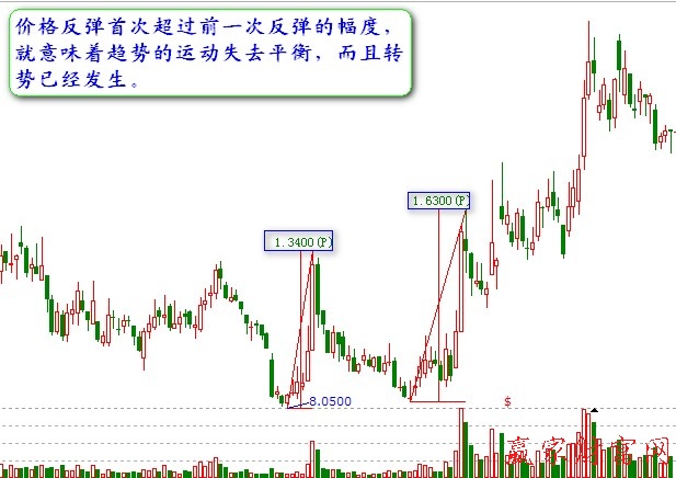 ②如果价格反弹首次超过前一次反弹的幅度,就意味着趋势的运动失去平衡,而且转势已经发生。