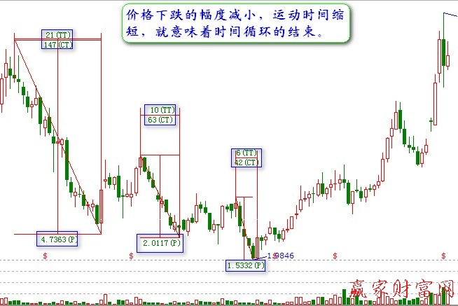 ③在空头的末期,相比前一段的市场运动,如果价格下跌的幅度减小,运动时间缩短,就意味着时间循环即将结束。