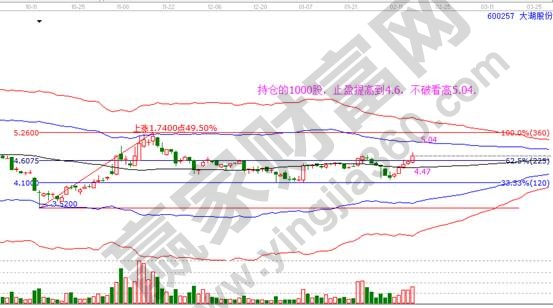 1. 大湖股份1000股持仓,当前在生命线上方走势稳健,生命线位置4.47不破属于强势,短线及账户的情况,建议止盈提高到225度支撑4.6,4.6不破,持股看高5.04;4.6击穿,获利出局,资金和精力放在被套个股上。