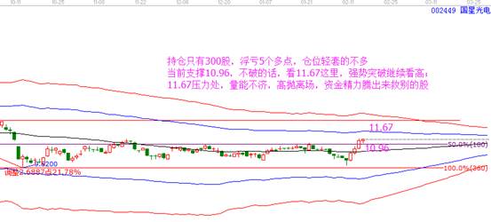 2. 国星光电,持仓只有300股,浮亏5个多点,仓位轻套的也不多。股票在生命线上震荡运行,走势稳健,10.96是当前支撑点,可以此位置做止损,不破看高11.67,届时再定。