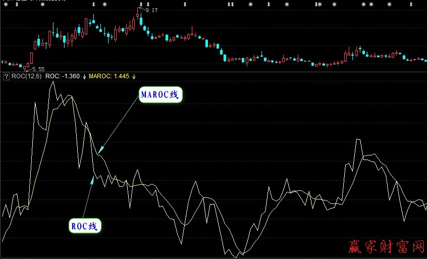 ROC指标是变动速率指标的简称。该指标包括两条指标线,分别是ROC线和MAROC线。其中,ROC线波动较快,MAROC线是ROC线的移动平均线,波动较慢。该指标统计的是个股当日的收盘价与其n日前某一天的收盘价的对比情况,以变动的大小来反映个股的变动快慢。该指标同其它很多技术分析指标一样,也是有大有小,有正有负。其中,当ROC的值是大于零时,说明当前股价比n日前的收盘价高,并且曲线位置越高,当前股价与n日前相比就高出很多;当ROC的值是小于零时,说明当前股价比n日前的收盘价低,且曲线位置越低,当前股价与n日前相比就低得越多。