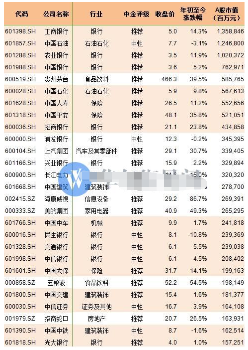 下表为中金公司在去年6月所列的222只MSCI成分股名单: