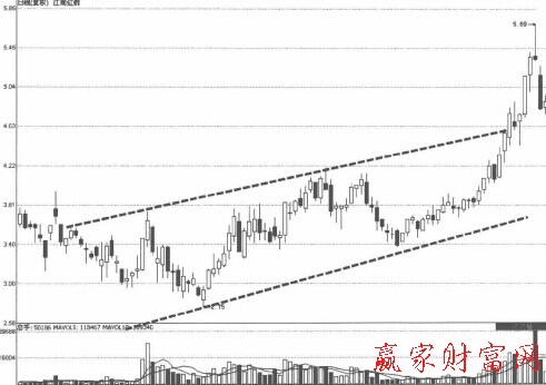 上图为江南红箭(000519) 2008年9月10日~2009年2月19日期间走势图。此股在大幅下跌后,在低位区出现了企稳上扬的走势。从图中虚线标注的一段走势,我们可以看到此股经常性地出现实体极大的大阳线形态,这种大阳线形态使得个股的股价重心不断上移,这是庄家在当日建仓力度较大的表现;而同期的阴线实体则显得相对短小,这是市场空方力量相对较弱的表现。