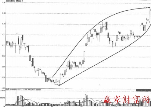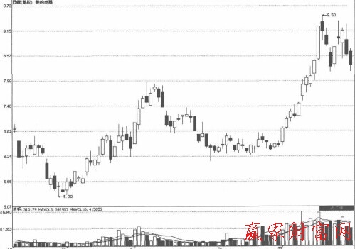 上图为美的电器(000527) 2008年10月15日~2009年2月25日期间走势图。此股在低位区的震荡上扬走势中,出现了较为明显的红肥绿瘦形态。透过这种红肥绿瘦的K线形态,我们可以更为准确地把握住庄家当前的建仓行为。