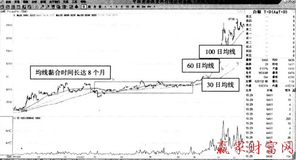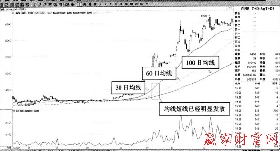 白银T+D——均线向上发散形态,如图所示。白银T+D的日K线中显示,均线长期黏合的形态出现了转变。从图中看来,三条不同的均线(30日、60日、100日)已经开始快速发散,显然是投资者做多的信号。白银价格持续拉升的时候,各条均线之间的距离逐步拉开。发散形态明显形成之前,投资者不容易判断这样的价格趋势。均线的发散程度是相对的,从黏合到发散状态也需要一个过程。这样一来,投资者做多开仓的操作可以渐进进行,而不是一次性地重仓买入白银。随着均线理论发散形态逐渐明确,白银价格的回升趋势也在不断得到确认,这个时候的加仓动作就非常安全了。面对均线持续发散的大趋势,投资者买涨获利再无较大的风险。