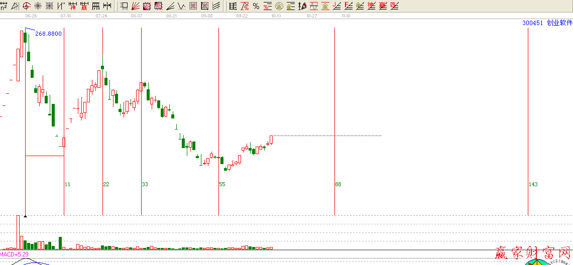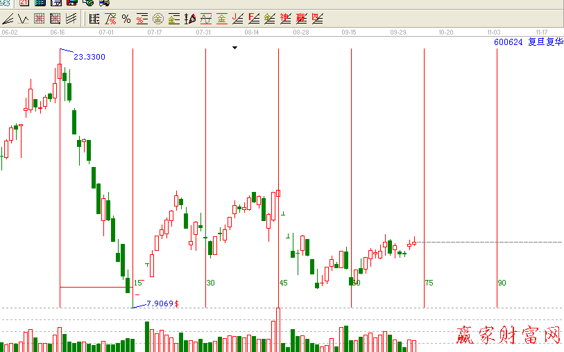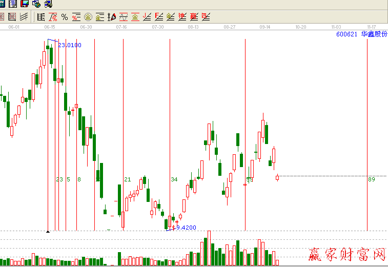 我们知道,在波浪理论中也有讲到周期,而他主要是依据斐波那契数列为基础的,也就是将斐波那契数列1、1、2、3、5、8、13、21、34、55、89……,将这一数字排列运用到周期线,然后我们观察指数或是个股的重要高点和低点之间的时间周期,高点和高点之间的时间周期,低点和低点之间的时间周期,神奇数字会一再的展现。比如一波上涨或是下跌至第5天,第8天、第13天,往往是形成高点或是低点,出现卖出机会或是买进机会。因此我们要注意这些重要的时间拐点。而在江恩理论中也运用了这一个神奇数列,有费氏时间循环线和费氏时间周期线两个工具。